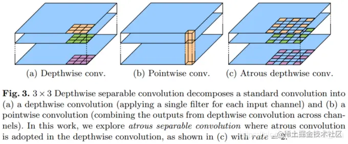 3.每个3x3的depthwise convolution(结合了空洞卷积)后都跟BN和Relu。