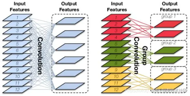分组卷积: 组卷积是对输入特征图进行分组,每组分别进行卷积。 假设输入特征图的尺寸为CHW (12× 5×5),输出特征图的数量为N (6)个,如果设定要分成G (3)个groups,则每组的输入特征图数量为C/G (4),每 组 的 输出特征图数量为N/G (2),每个卷积核的尺寸为(C/G)KK (4×5×5),卷积核的总数仍为N (6)个,每组的卷积核数量为N/G (2),每个卷积核只与其同组的输入特征图进行卷积,卷积核的总参数量为N*(C/G)KK,可见,总参数量减少为原来的1/G。