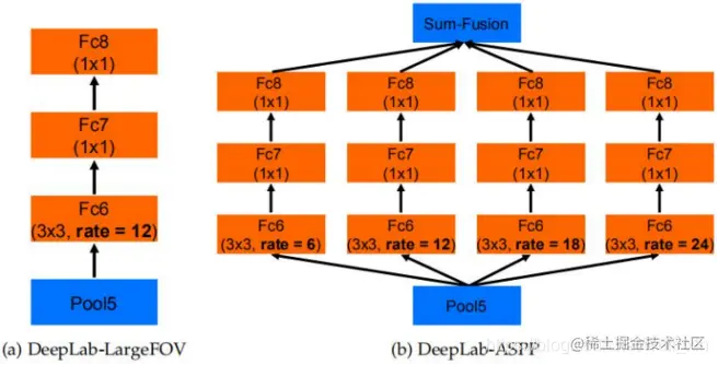 ASPP模块构成——>DeepLab v1到DeepLab v2的进化——>基于VGG16的DeepLab v2在v1的基础上做了进一步调整(FC6-FC8替换为ASPP)