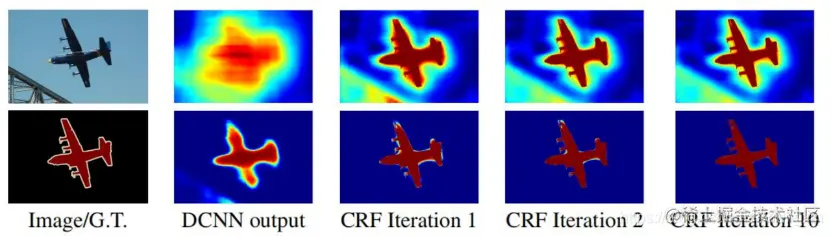 DeepLab v1:VGG16+空洞卷积+CRF对边缘分割结果进行后处理。针对下采样或池化降低分辨率,DeepLab采用了空洞卷积来扩展感受野,获取更多的上下文信息。同时,采用完全连接的条件随机场(CRF)提高模型捕获细节的能力。