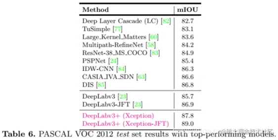 DeepLab v3+通过添加一个简单而有效的解码器模块扩展DeepLab v3以优化分割结果,在PASCAL VOC 2012数据集和Cityscapes数据集中分别取得了89%和82.1%的MIOU。
