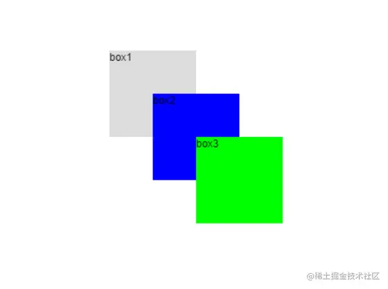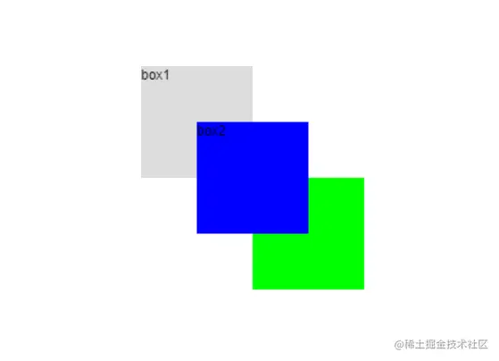 可以发现在后面绘制的图形默认层级会更高,如果我们想修改默认的层级就需要使用上面提到的两个属性。我们对上面的代码做一些修改,实现box2在最上方得效果。