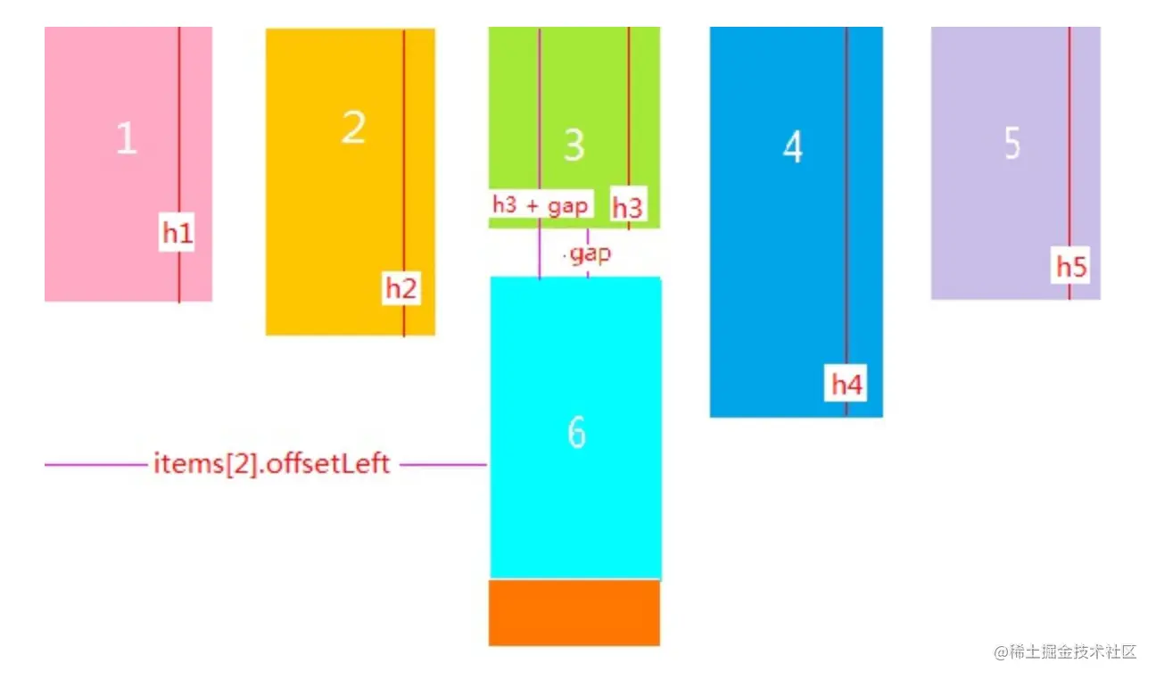 例如上图,元素6的top值就是元素3的高度加上元素3的高度。他的left值就是最小列元素的offsetLeft。代码表示如下: