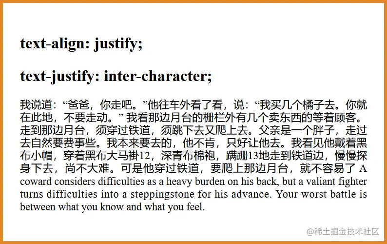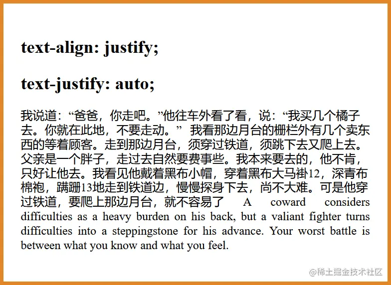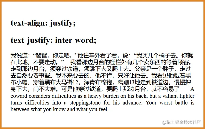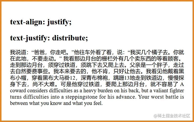 text-justify 必须与text-align: justify;同时出现,如果你还不知道text-align: justify;是啥,请立即阅读学透CSS-深度剖析text-align家族 文本属性(上) (连载中),看完再来看这篇文章。
