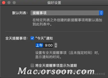 mac中如何开启提醒事项今天通知功能? Windows阿咪 2021-08-09 320 阅读1分钟 未来小编今天为大家分享,如何开启Mac提醒事项今天通知功能?Mac上的提醒事项是Mac自带的一款原生应用程序。对于那些平时工作生活安排非常有条理的朋友来说,这款应用还是非常重要的。下面就是具体操作方法啦~快来看看吧! 温馨提示:资深mac用户可忽略 方法操作: 1.打开提醒事项。 2.点击提醒事项菜单。 3.点击偏好设置。 4.点击选中今天通知选项。 5.选中后就可以了。 是不是很简单呢!你学会了吗?