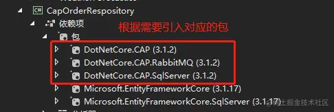 这里因为用的是RabbitMQ、SqlServer,所以需要引入以下几个包;如果用其他消息队列或数据库,可以引入对应的包。