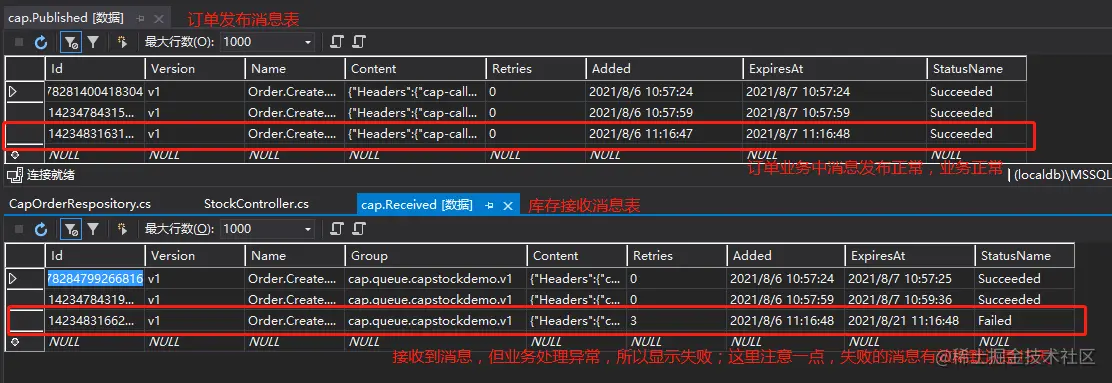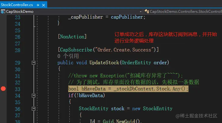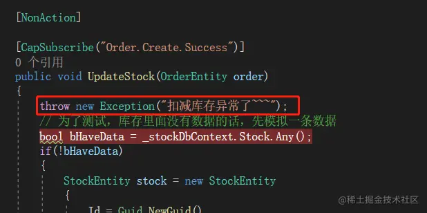 // 标记为不实Action [NonAction] // 订阅消息,参数和发布时指定的参数一致 [CapSubscribe("Order.Create.Success")] public void UpdateStock(OrderEntity order) { //throw new Exception("扣减库存异常了~~~"); // 为了测试,库存里面没有数据的话,先模拟一条数据 bool bHaveData = _stockDbContext.Stock.Any(); if(!bHaveData) { StockEntity stock = new StockEntity { Id = Guid.NewGuid(), ProductNo = "Product001", StockCount = 100, UpdateDate = DateTime.Now }; _stockDbContext.Stock.Add(stock); _stockDbContext.SaveChanges(); } // 模拟扣减库存 using var trans = _stockDbContext.Database.BeginTransaction(_capPublisher, autoCommit: false); try { // 根据产品编号找到产品 var product = _stockDbContext.Stock.Where(s => s.ProductNo == order.ProductNo).FirstOrDefault(); // 扣减库存之后保存 product.StockCount = product.StockCount - order.Count; _stockDbContext.Update(product); _stockDbContext.SaveChanges(); // 可以继续向下发布流程,比如库存扣减成功,下一步到物流服务进行相关处理,可以继续发布消息 // _capPublisher.Publish(); trans.Commit(); Console.WriteLine(order.OrderNo); } catch (Exception ex) { trans.Rollback(); } }可以看到,订阅很简单,直接标上[CapSubscribe("Order.Create.Success")]这个Attribute就行了,如果消息状态为失败,后续CAP的定时任务会根据定时策略调用此方法。