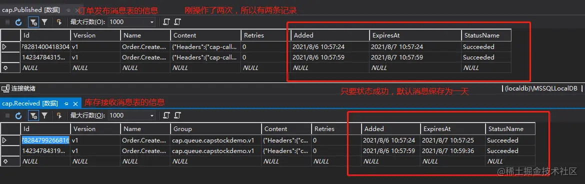 如上图,稍等一会,消息就自动处理了,业务数据符合预期,保证一致性。 这个是CAP内部定时读取消息表,根据状态不断重试业务逻辑,直到成功为止。 CAP的全自动是不是感觉比较便捷,写最少的代码,解决了最难搞的分布式事务。