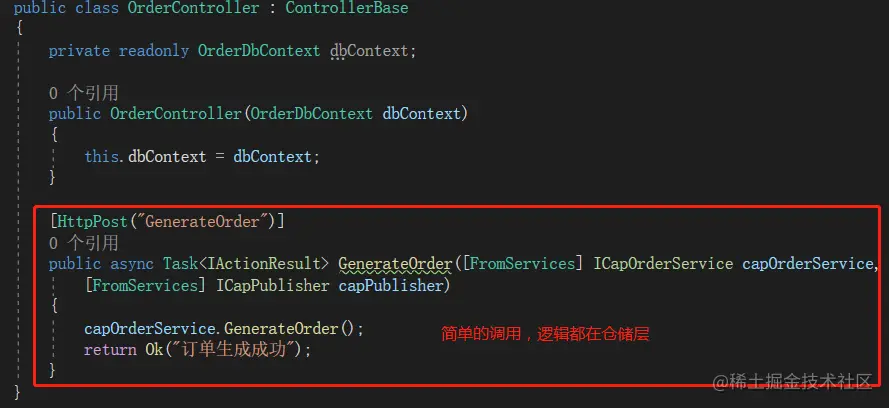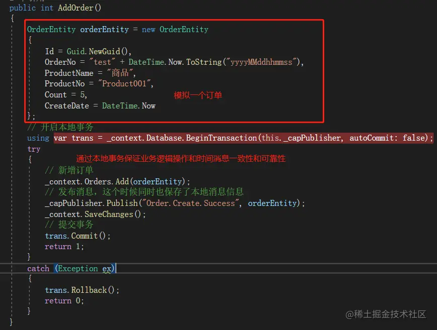 图中用到的_capPublisher是通过构造函数注入的。订单服务其他层的代码就不用截图了,就是简单调用,源码地址在文末。