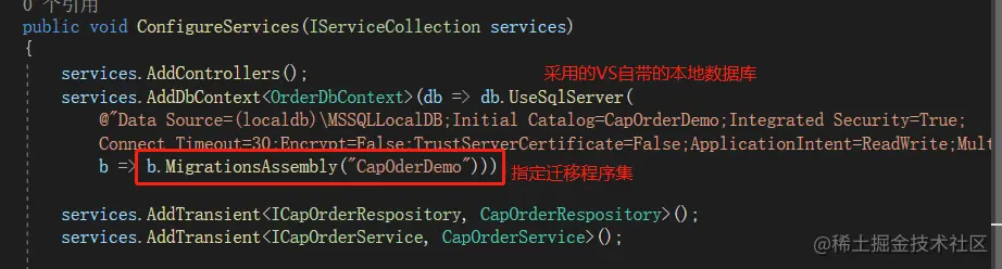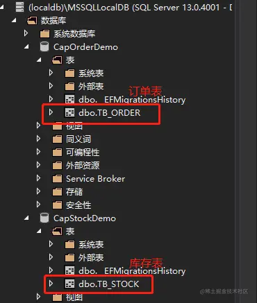 这里模拟两个服务,一个是订单服务,一个是库存服务,两都用到EF(Code First),如果小伙伴对EF入门还不熟,<<跟我一起学.NetCore之EF Core 实战入门,一看就会>>这篇文章超详细,肯定能帮到你; 所以接下来就上几张关键的图就行啦。
