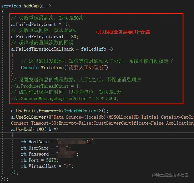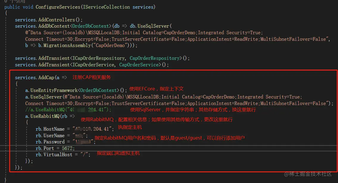 订单服务和库存服务都是在各自项目的Startup文件中注册CAP相关服务,并配置相关信息,如下图: