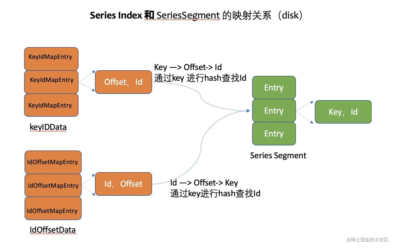- idOffsetMap 通过 Id 查到到 offset,通过这个 offset(对应 SeriesSegment 的位置)来查找 SeriesSegment 文件获取 key。