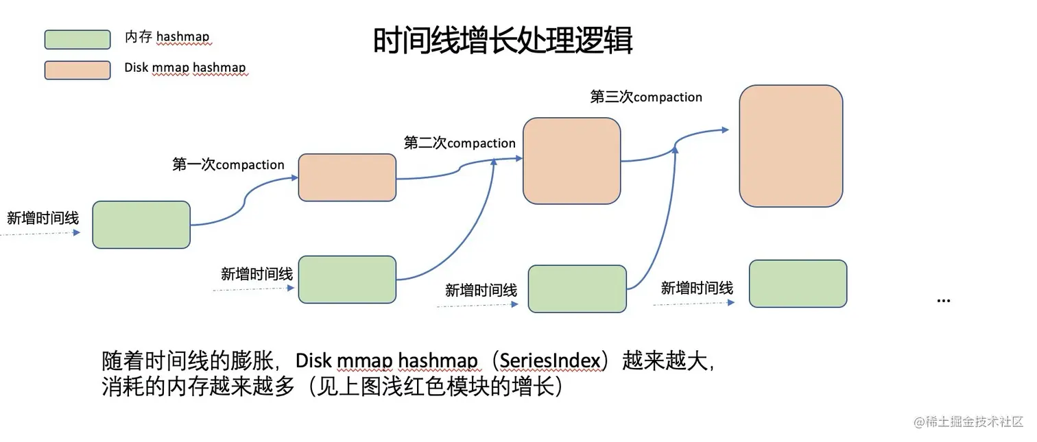 influxdb 的做法是将新增的 series key 先放到内存 hashmap 里面,当内存 hashmap 增长大于阈值时,将内存 hashmap 和磁盘 hashmap 进行 merge(遍历所有 SeriesSegment,过滤已经删除的 series key)生成一个新的磁盘 hashmap,这个过程叫做 compaction。compation 结束后内存 hashmap 被清空,然后继续存放新增的 series key。