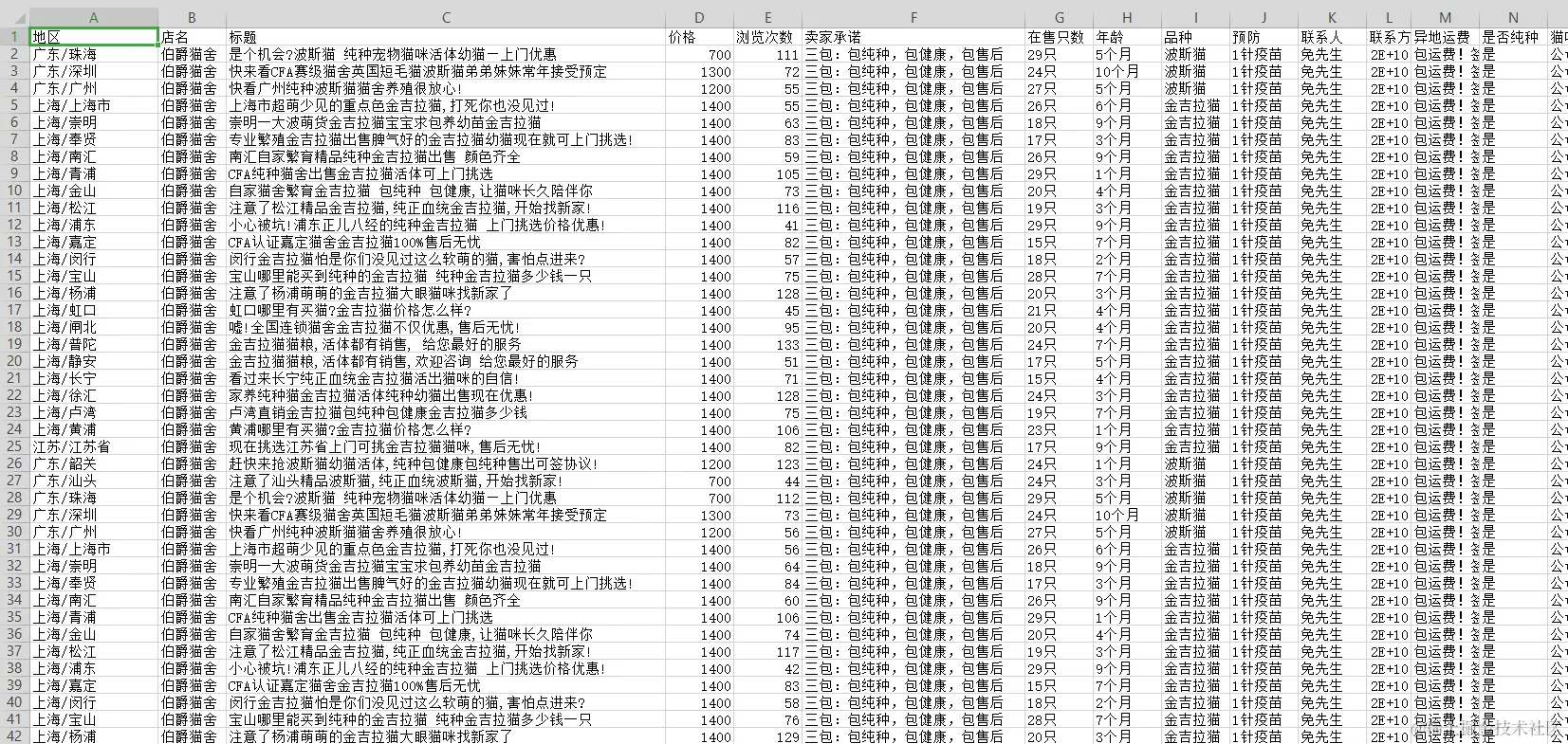 网上的数据太多、太杂,而且我也不知道哪个网站的数据比较好。所以,只能找到一个猫咪交易网站的数据来分析了