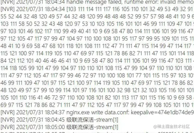 在测试期间,EasyNVR出现日志显示为数字的一段,无法看出是什么问题。