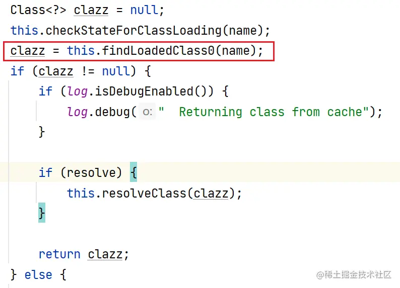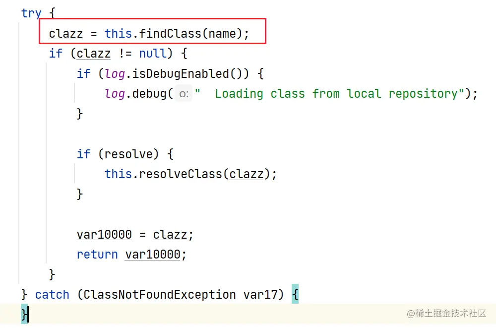 OK,在理解了整个类加载器结构后,我们再来看 WebAppLoader 是如何加载我们的类的,重点查看 loadClass 方法,由于代码过长,直接截取核心代码: