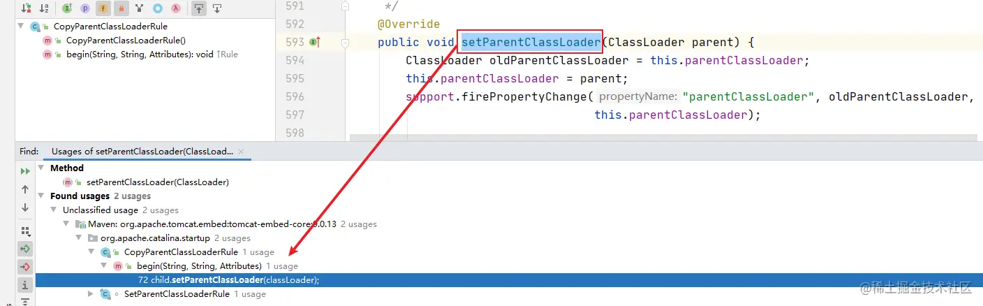可以看到这个设置方法被CopyParentClassLoaderRule的begin方法中赋值了: