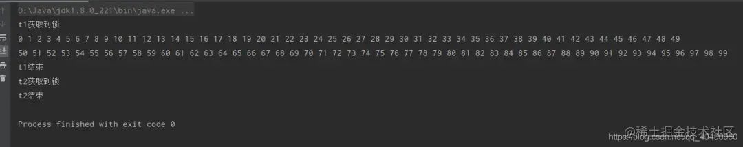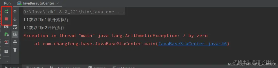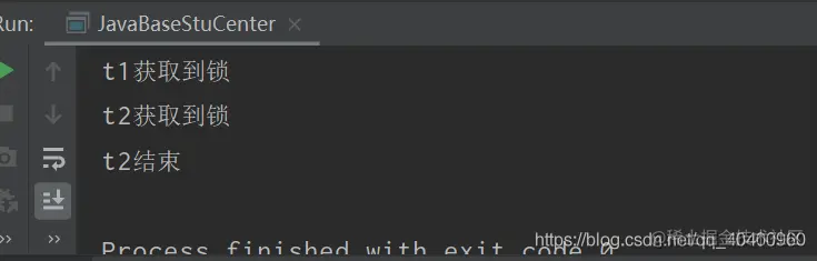 可以看到,当线程t1在获取到o1和o2两个锁开始执行,在还没有执行结束的时候,主线程调用了t1的stop方法中断了t1的执行,释放了t1线程获取到的所有锁,中断后t2获取到了o1和o2锁,开始执行直到结束,而t1却夭折在了sleep的时候,sleep后的代码没有执行。