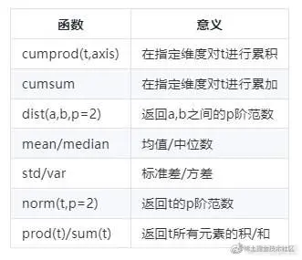 简单的理解,就是对张量进行归并或者说合计等操作,这类操作的输入输出维度一般并不相同,而且往往是输入大于输出维度。而Tensor的归并函数如下表所示:
