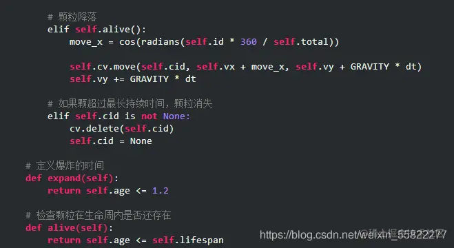 以上代码部分均与Tkinter无关,只是定义了颗粒对象以及模拟颗粒生命周期的全过程,下面将使用Tkinter完成最终的效果。