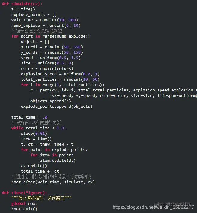 有了这些参数,我们就可以定义循环产生每个颗粒对象了,并将每个烟花的所有颗粒对象储存在objects中。也就是说explore_points是列表中套列表,内层列表是每个烟花的所有颗粒对象,外层列表是所有烟花。