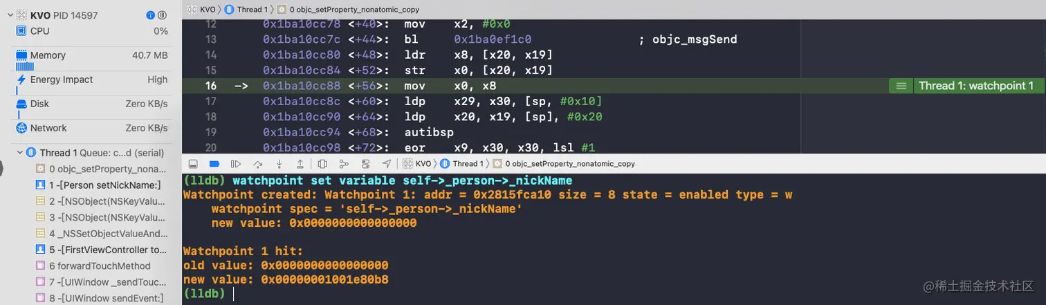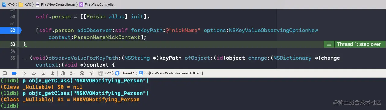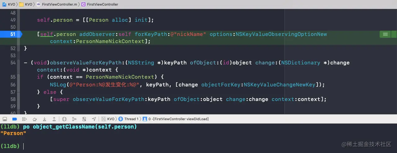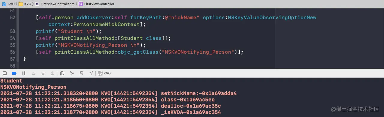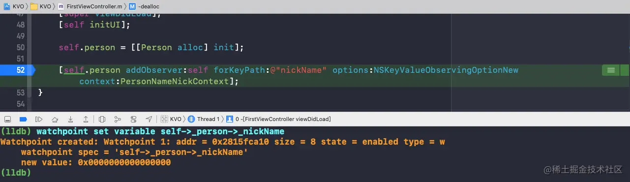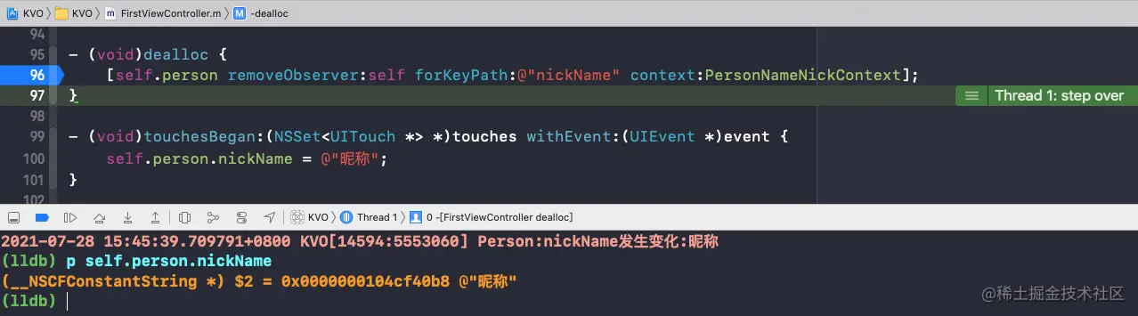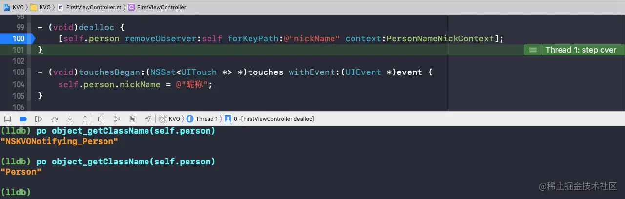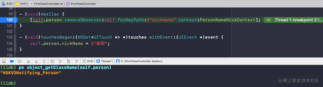 可以看到,在移除观察者时,isa已经指向了Person,而且nickName的值也改变了,那么此时的setter方法是Person的;