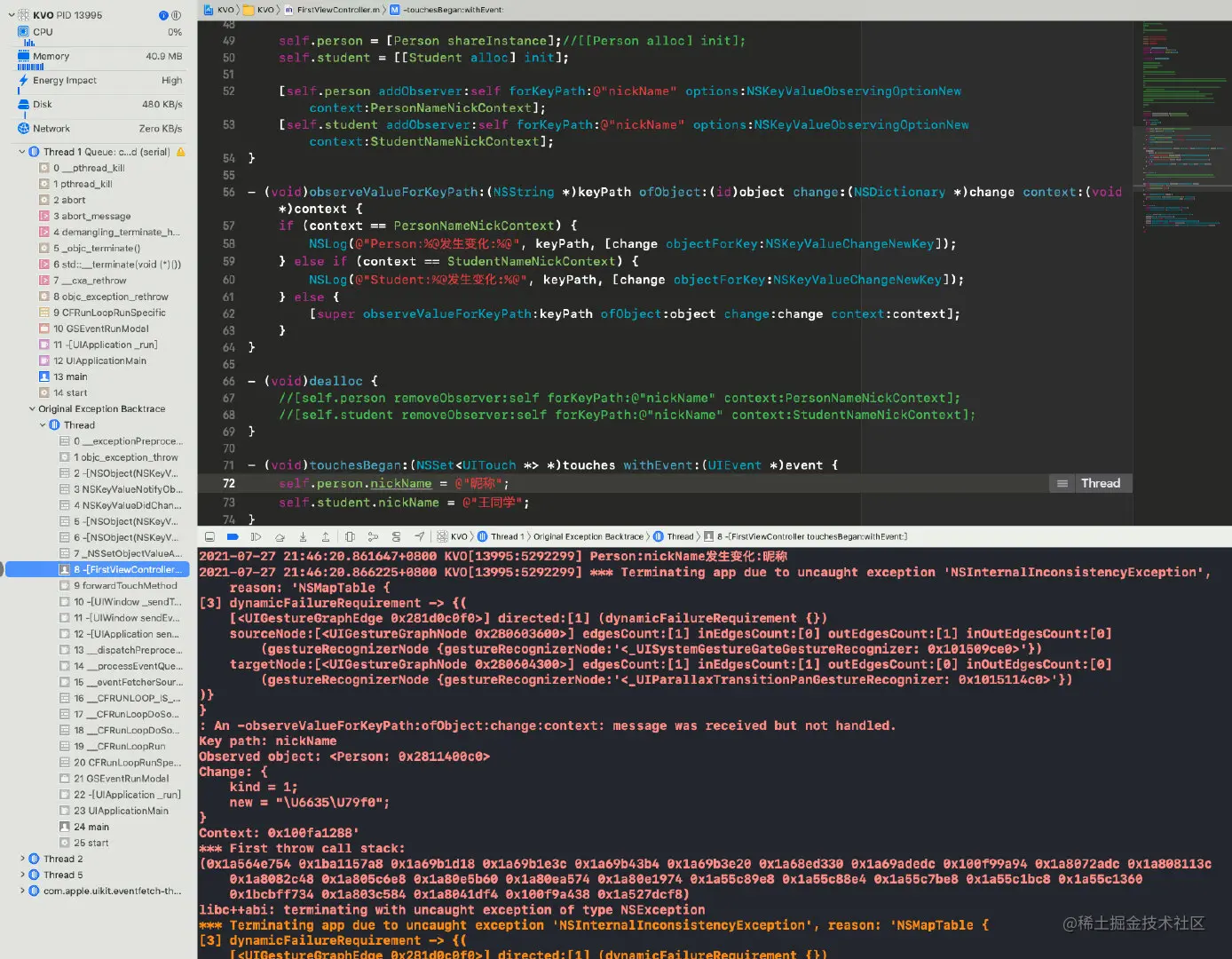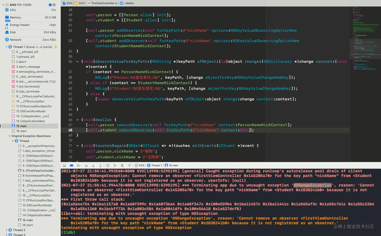 所以,为了防止出现这种情况,建议在dealloc中移除观察者。需要注意的是,如果使用了context,那么移除时也要使用相同的context,否则将会崩溃,抛出名为NSRangeException的异常: