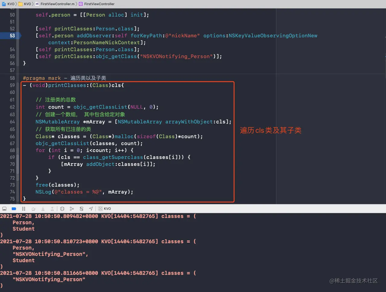 我们首先来遍历一下Person在注册观察者前后的子类是否有变化: