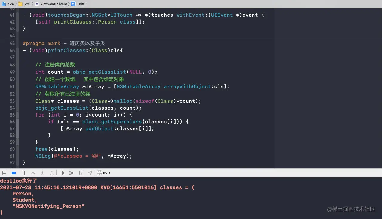 对象的属性注册为观察者时,将会修改被观察对象的isa指针,指向一个中间类而不是真正的类。因此,isa指针的值不一定反映实例的实际类; - 不应该依赖