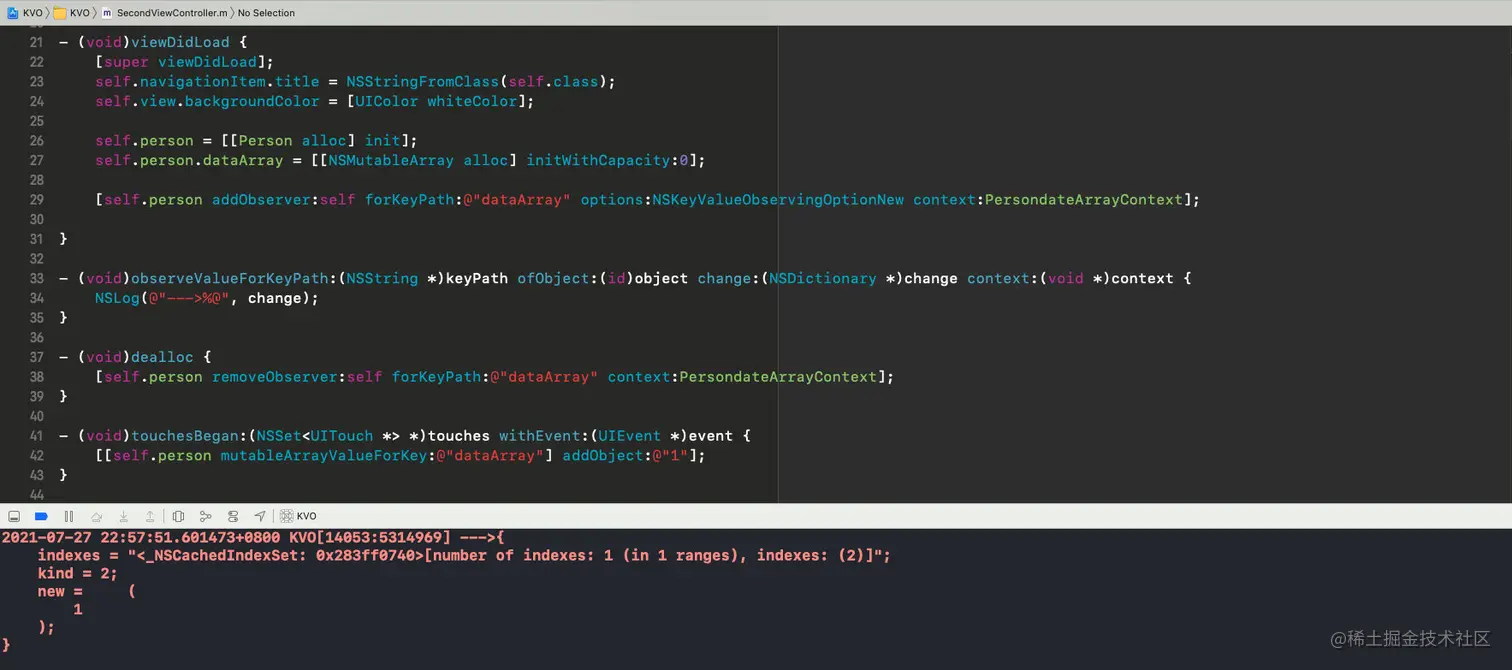 NSRangeException,可以通过调用一次removeObserver:forKeyPath:context:来应对addObserver:forKeyPath:options:context:;如果在项目中这种方式不可行时,可以把removeObserver:forKeyPath:context: call放在try/catch块中来处理潜在的异常; - 当被释放时,观察者不会自动释放自己。被观察的对象继续发送通知,而忽略了其状态。但是,与发送到已释放的对象的其他消息一样,更改通知也会触发内存访问异常。因此,应该确保观察者在从内存中消失之前将自己删除。