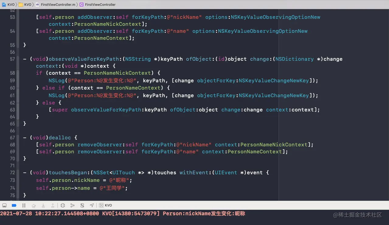 为了监听Person和Student两个类的相同的nickName属性,我们在接收监听回调时,为了区分nickName来自于哪个对象,除了使用keyPath只要,还需要使用object来判断来源对象,才能准确区分是谁的nickName发生了变化;