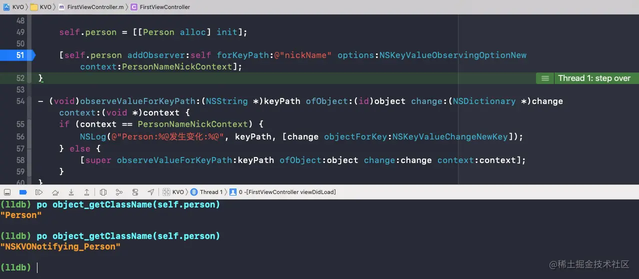 在注册成为观察者之后,实例对象person的isa指向NSKVONotifying_Person;