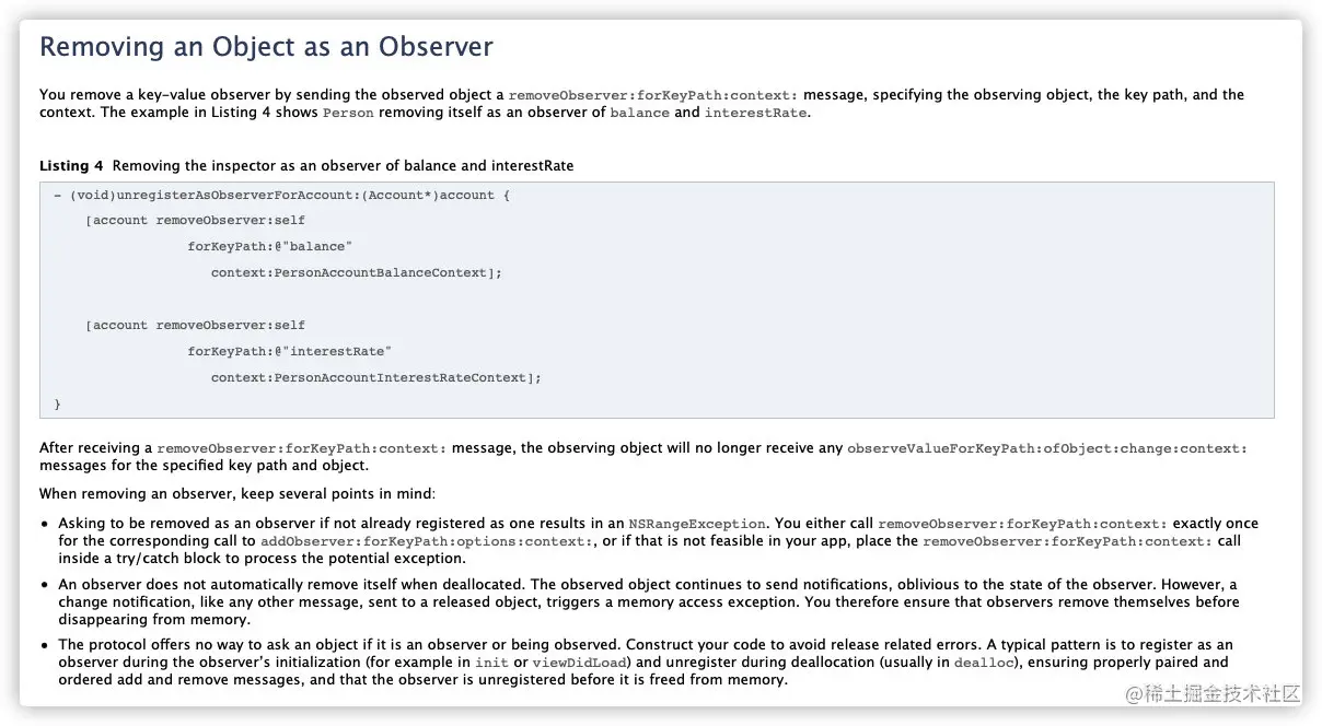 KVO官方文档中关于removeObserver的说明如下: