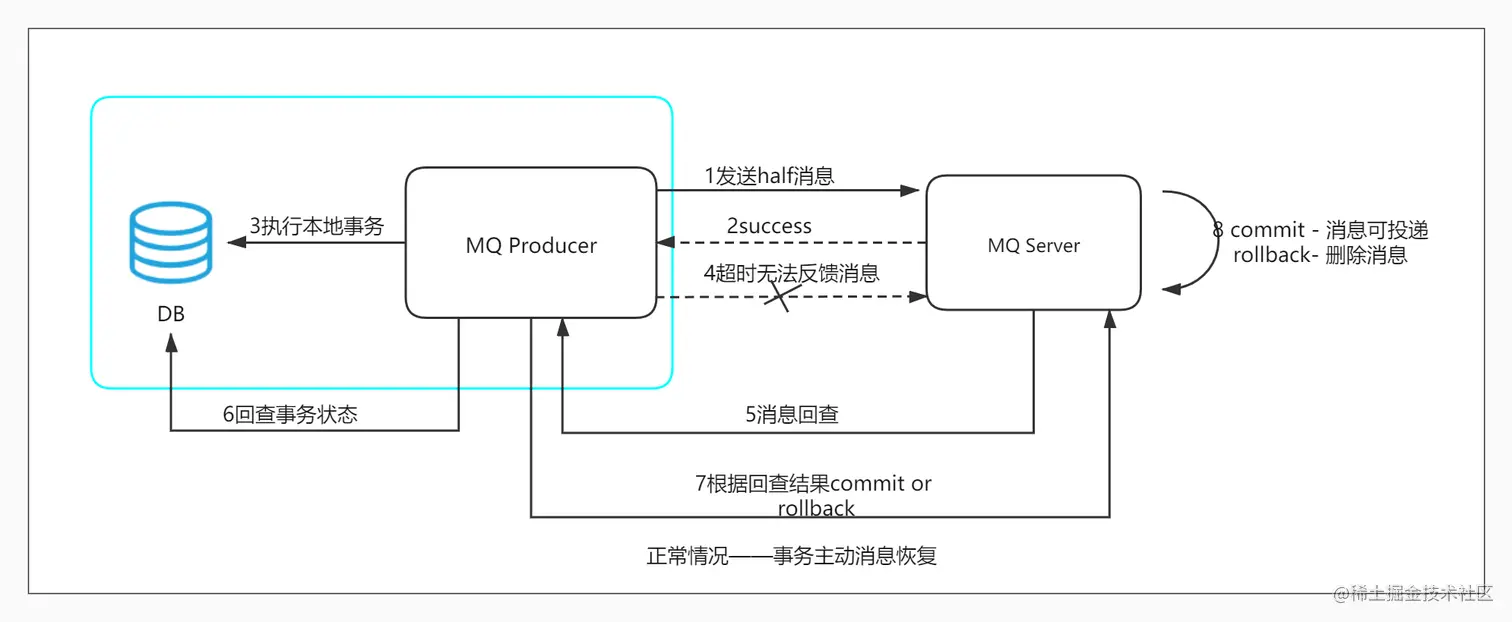 - 步骤5 MQ Server 收到 commit 状态则将半消息标记为可投递,订阅方最终将收到该消息;MQ Server 收到 rollback 状态则删除半消息,订阅方将不会接受该消息。