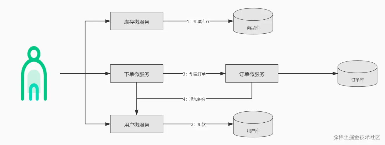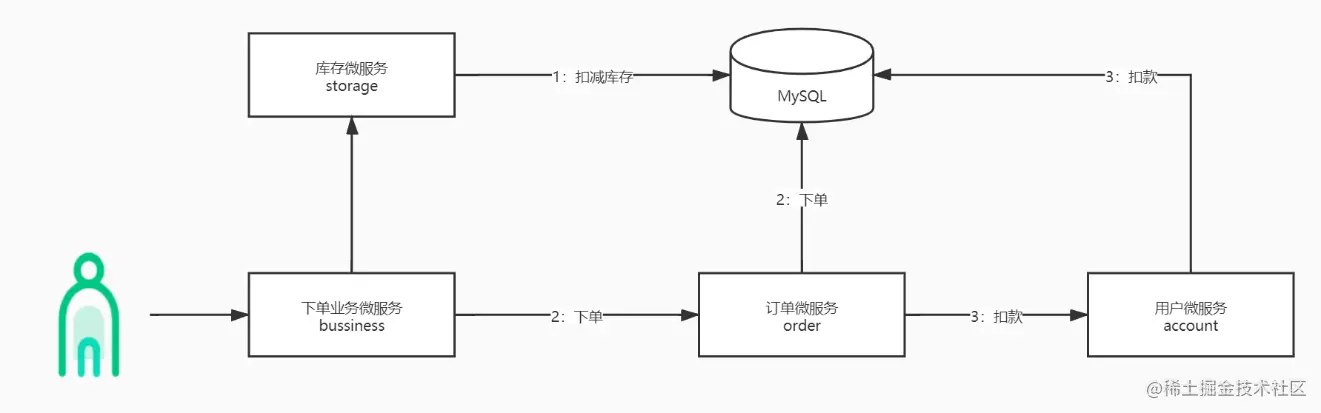比如下单业务需要调用库存微服务扣减库存,库存微服务操作商品库,下单业务有需要调用用户微服务,实现增加用户积分操作,用户微服务又调用用户库,这样一个下单业务,就需要调用多个微服务,访问多个数据库。