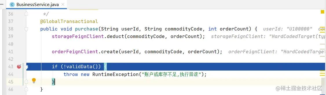 重启项目,数据初始化后,浏览器访问分布式事务回滚方法“/purchase/rollback”,在bussinessService类43行处,设置断点如图5-20所示。