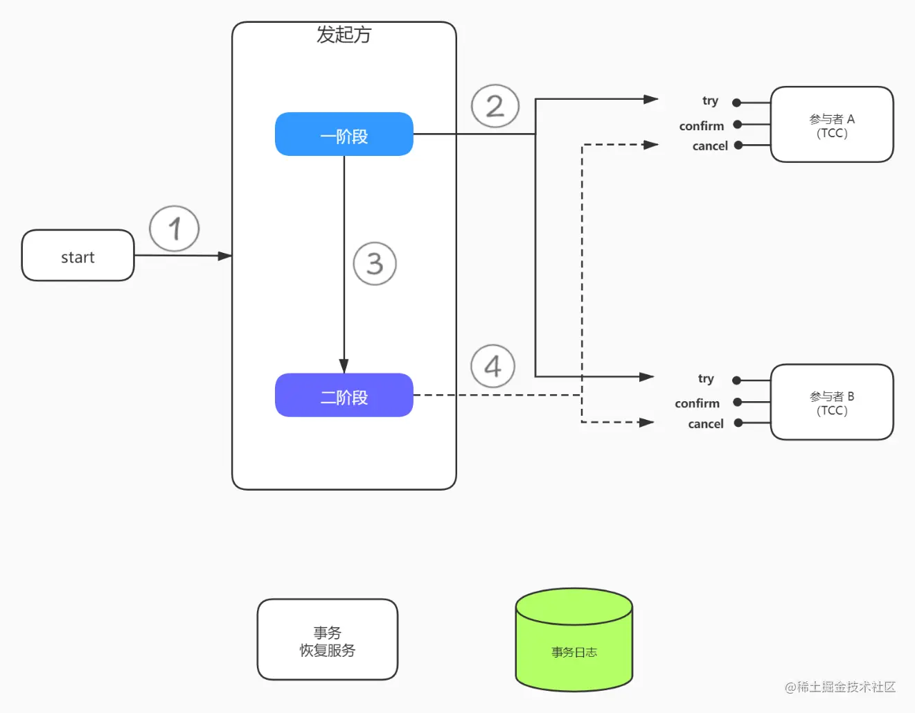 - Confirm 阶段主要是对业务系统做确认提交,Try阶段执行成功并开始执行 Confirm阶段时,默认 Confirm阶段是不会出错的。即:只要Try成功,Confirm一定成功。