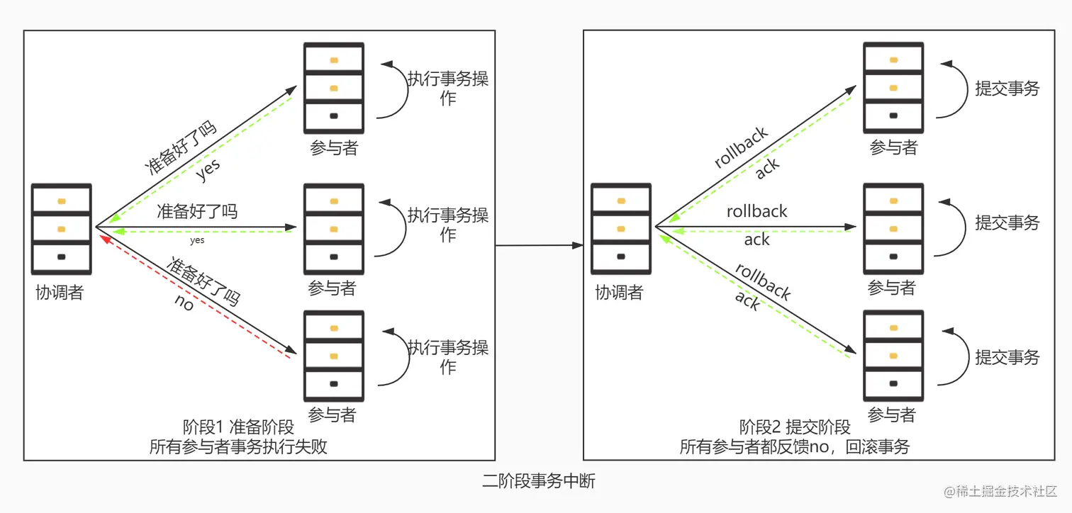 - 协调者收到所有参与者反馈的 ack 消息后,即完成事务中断。