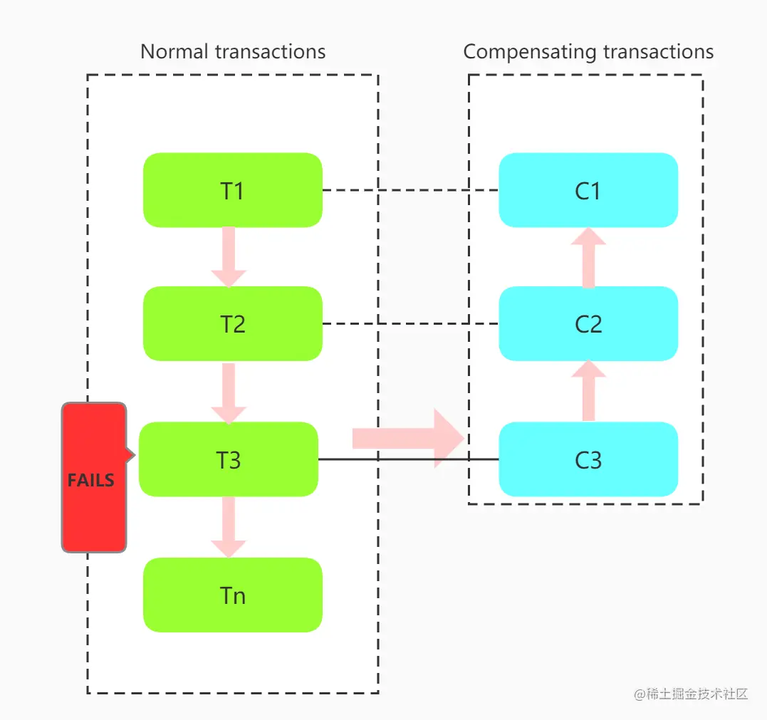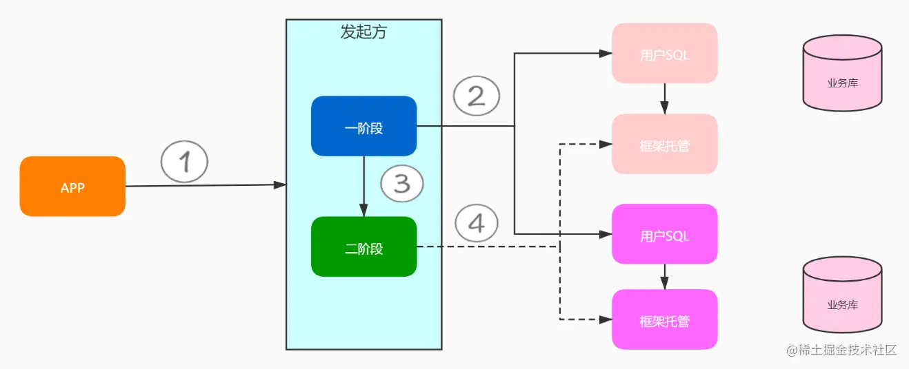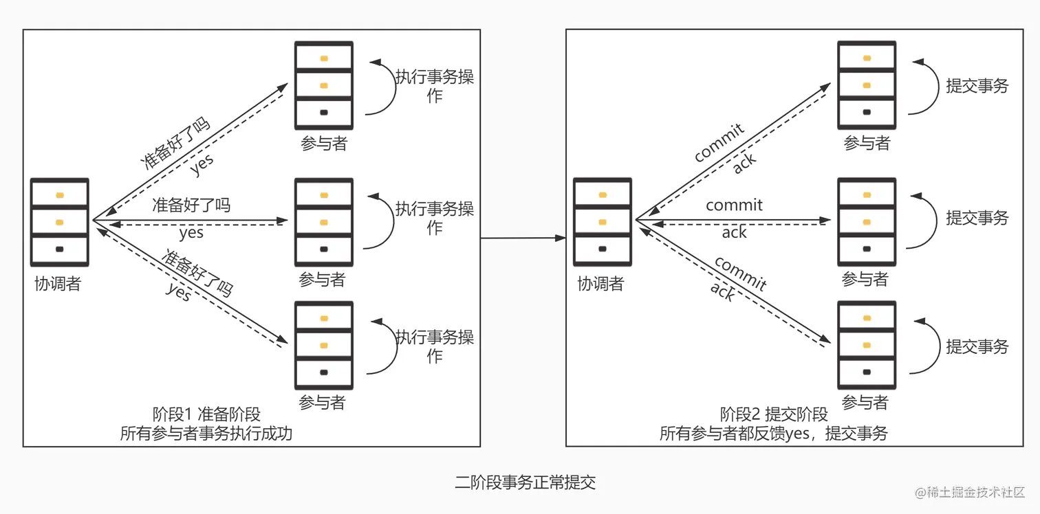 - 提交阶段(commit phase):如果事务管理器收到了参与者的执行失败或者超时消息时,直接给每个参与者发送回滚(Rollback)消息;否则,发送提交(Commit)消息;参与者根据事务管理器的指令执行提交或者回滚操作,并释放事务处理过程中使用的锁资源。注意:必须在最后阶段释放锁资源。