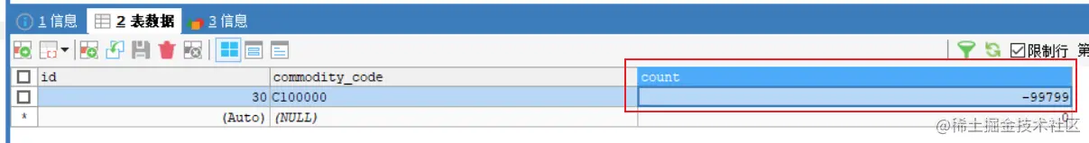重启项目,数据初始化后,浏览器访问分布式事务回滚方法“/purchase/rollback”因为此方法,购买商品数量99999,大于库存数。所以分布式事务回滚,执行后查看数据,已回滚。