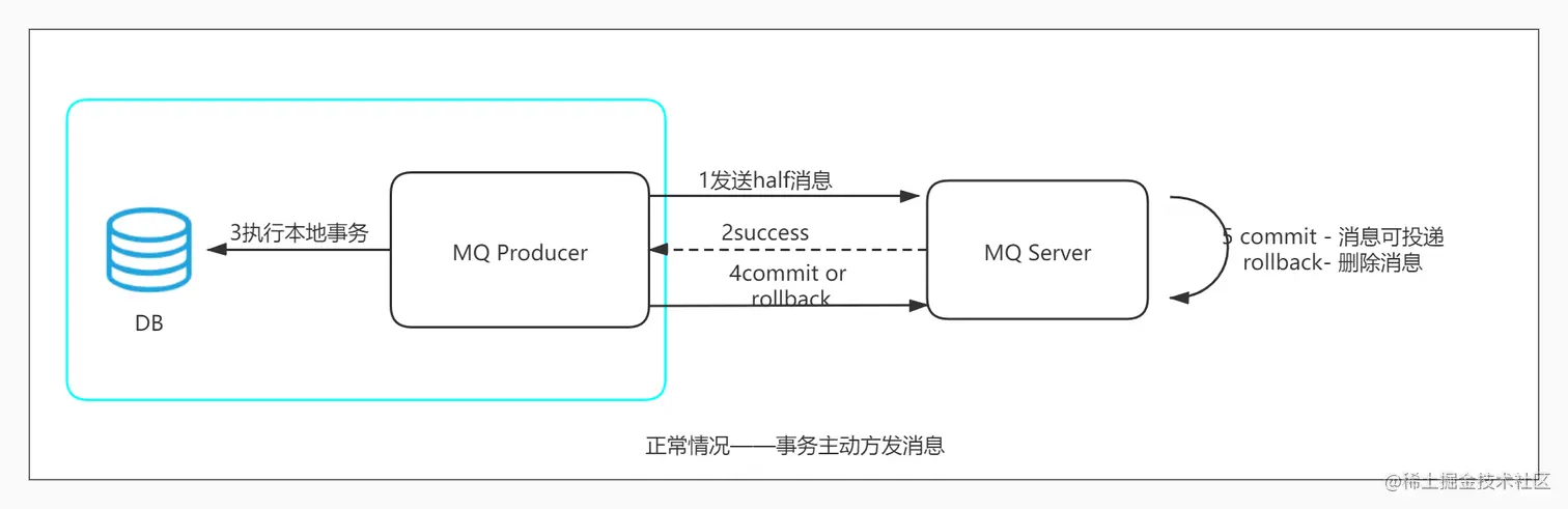- 步骤5 MQ Server 收到 commit 状态则将半消息标记为可投递,订阅方最终将收到该消息;MQ Server 收到 rollback 状态则删除半消息,订阅方将不会接受该消息。