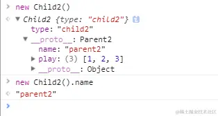 可以看到在Child2的实例的__proto__的属性中有Parent2的属性,由此实现了Child2从Parent2的继承。