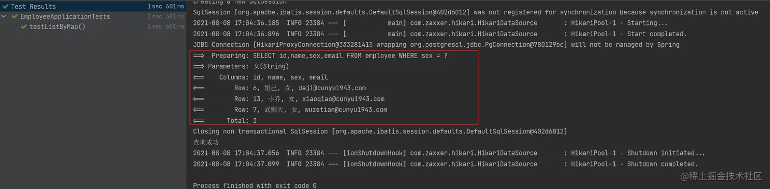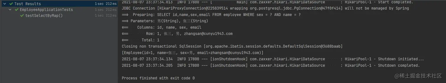 除开支持主键查询外,MP 还支持条件查询,只要将我们的条件传入 Map 列表中,然后将其作为 selectByMap 方法的参数即可,其中传入 Map 的 key 对应我们数据库中的字段,而 value 则对应字段的值。