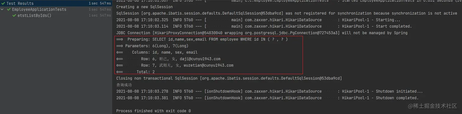 上一个方法每次只能查询一条记录,如果我们想要查询多条数据记录,那么就可以将要查询数据的主键列表传入 selectBatchIds 方法即可。