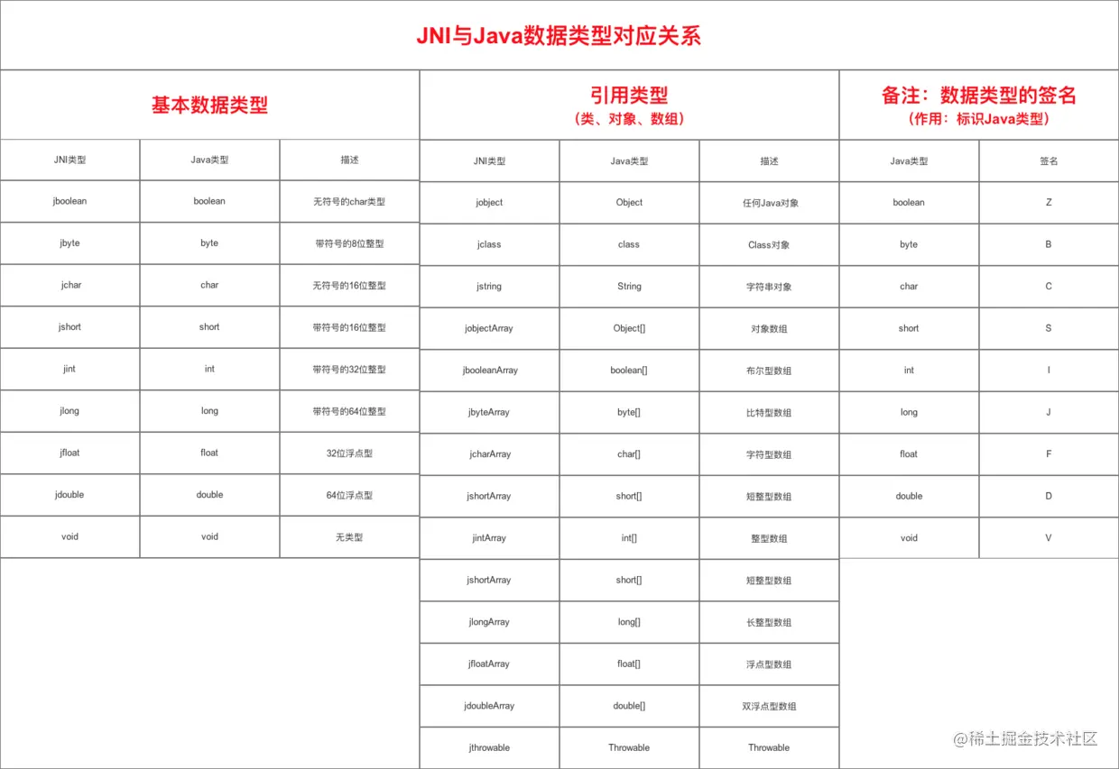 而jstring则对应了Java中的String类,JNI中有很多类似jstring的类来对应Java中的类,下面是Java中的类与JNI类型的对照表