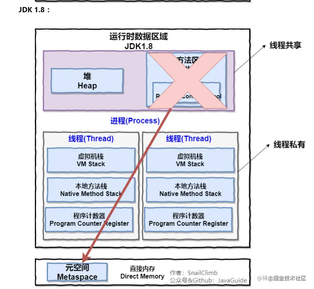 我们看到1.8作为1.6的升级版,也是java长期支持的一个版本还是做了一些升级的,那就是删除了方法区加入了元空间,点击这里看原因