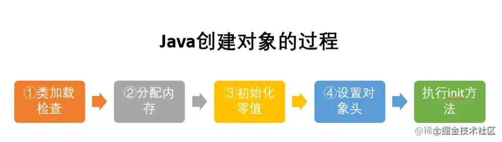 ①类加载检查: 虚拟机遇到一条 new 指令时,首先将去检查这个指令的参数是否能在常量池中定位到这个类的符号引用,并且检查这个符号引用代表的类是否已被加载过、解析和初始化过。如果没有,那必须先执行相应的类加载过程。