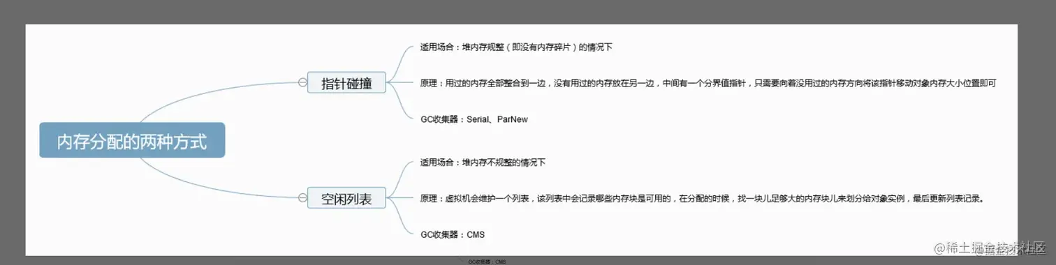 选择以上两种方式中的哪一种,取决于 Java 堆内存是否规整。而 Java 堆内存是否规整,取决于 GC 收集器的算法是"标记-清除",还是"标记-整理"(也称作"标记-压缩"),值得注意的是,复制算法内存也是规整的
