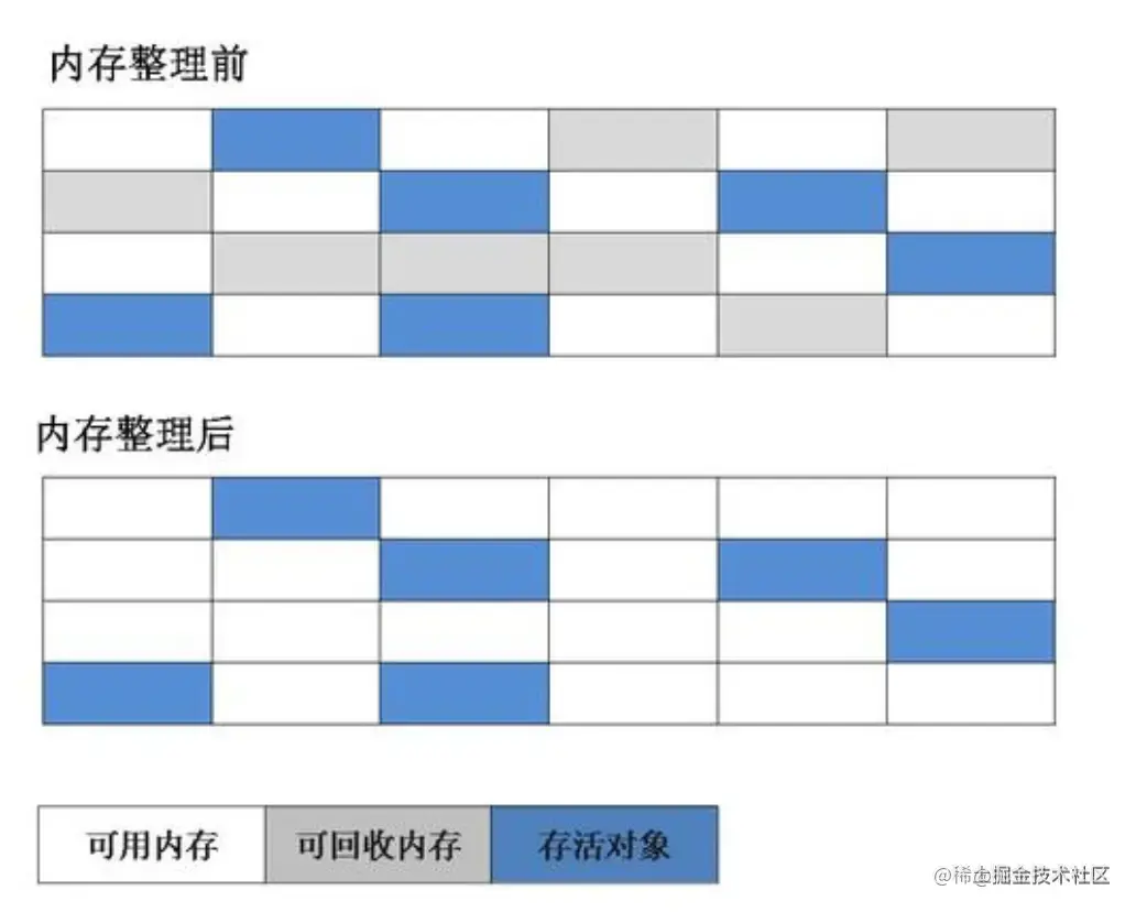 原理:将所有存活的对象放在一起,剩下的直接消掉。