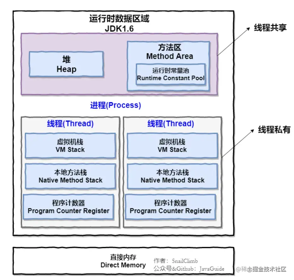 | 程序计数器 | 流程控制,记录位置 | 生命周期同线程 |